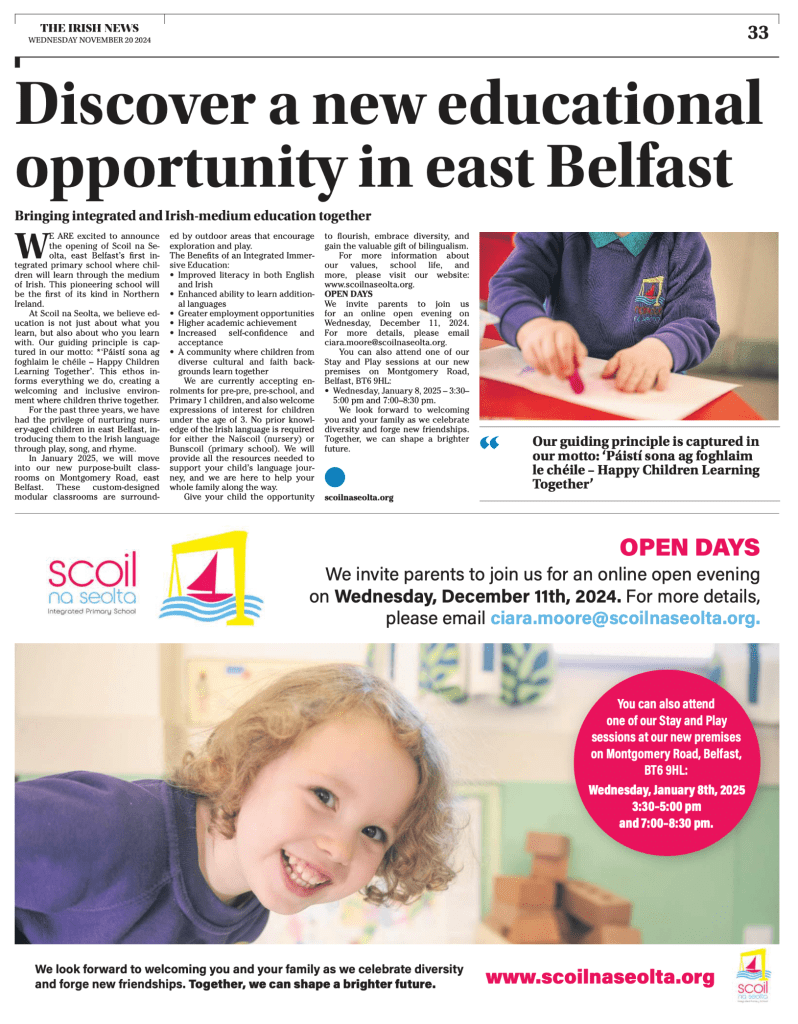 Céim eile chun tosaigh agus ábhar dóchais d’oideachasóirí ar fud na tíre (fógarfhocal ón Irish News inné). Exciting times for IME in East Belfast.